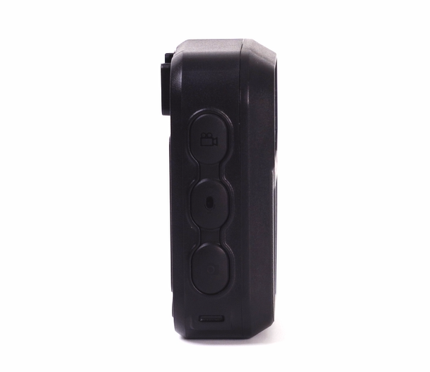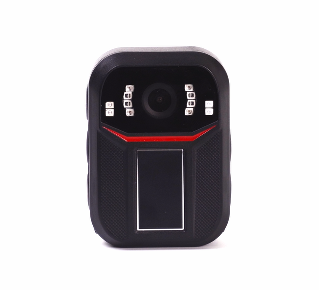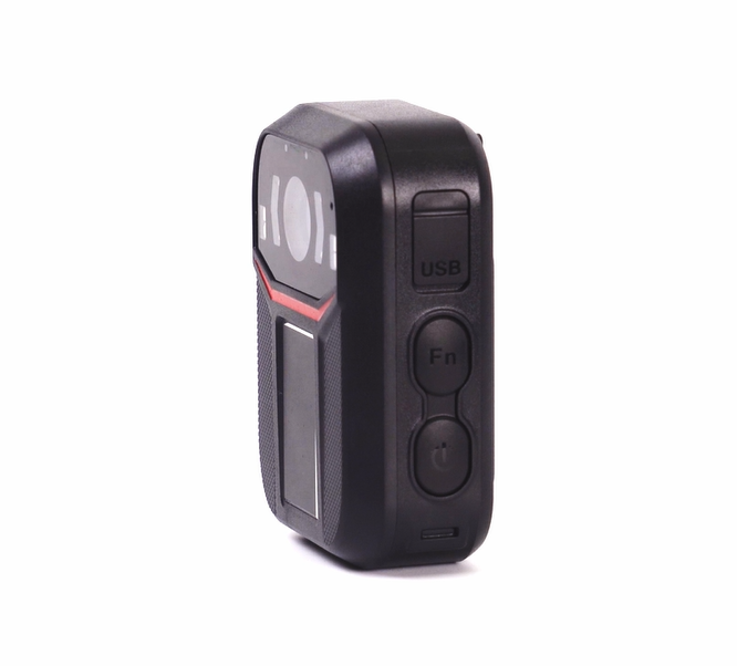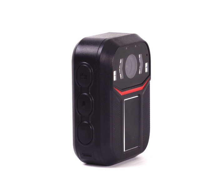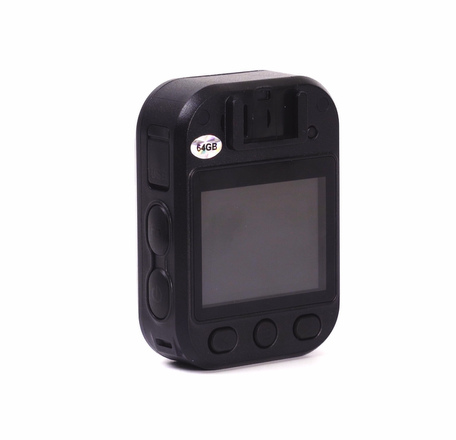 This body camera captures HD video and clear images, with infrared night vision for low-light recording. It features a red and blue flashing alarm, emergency alert, and manual night vision control for enhanced safety.