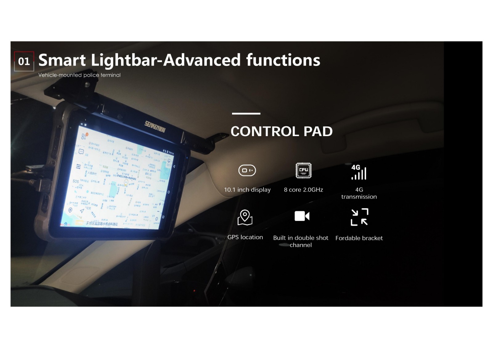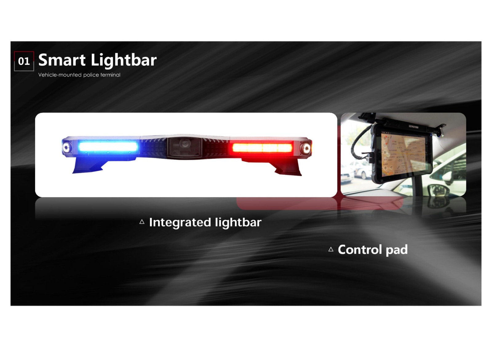 It is fully new compact design of smart lightbar integrated with lights, sirens, cameras and control pad, with functions of image/video wireless transmission, ideally for the application of traffic police force to achieve the efficient patrol duty, to enable the command center to quickly grasp on site police force situation and reliable data proof. ANPR and speed enforcement could be realized based on SDK developed tools according to different countries policies.