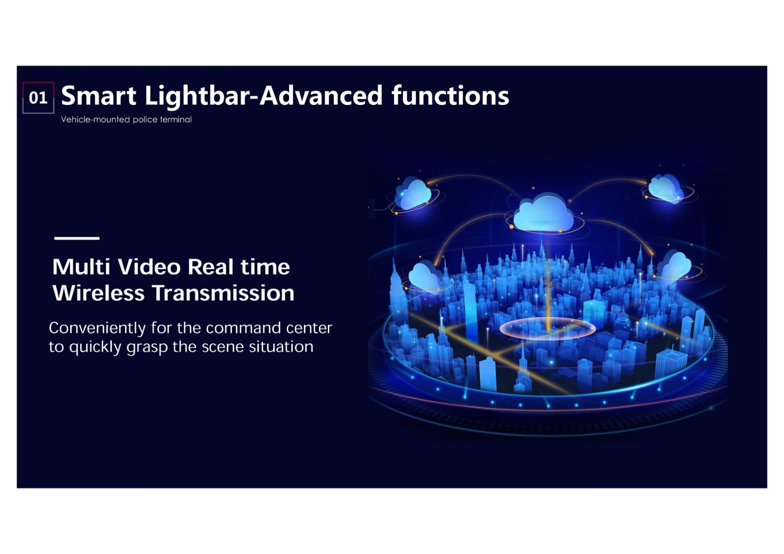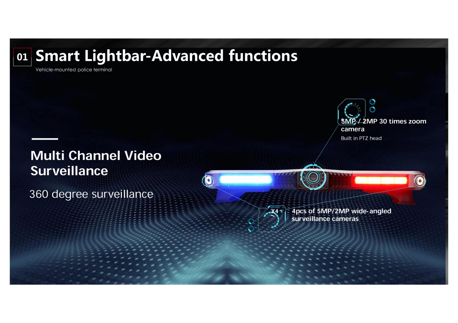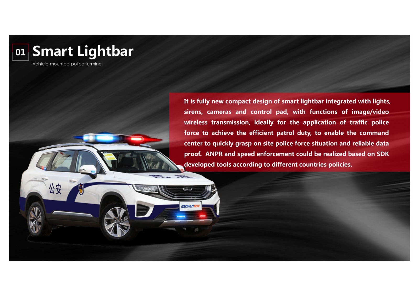 It is fully new compact design of smart lightbar integrated with lights, sirens, cameras and control pad, with functions of image or video wireless transmission, ideally for the application of traffic police force to achieve the efficient patrol duty, to enable the command center to quickly grasp on site police force situation and reliable data proof. ANPR and speed enforcement could be realized based on SDK developed tools according to different countries policies.