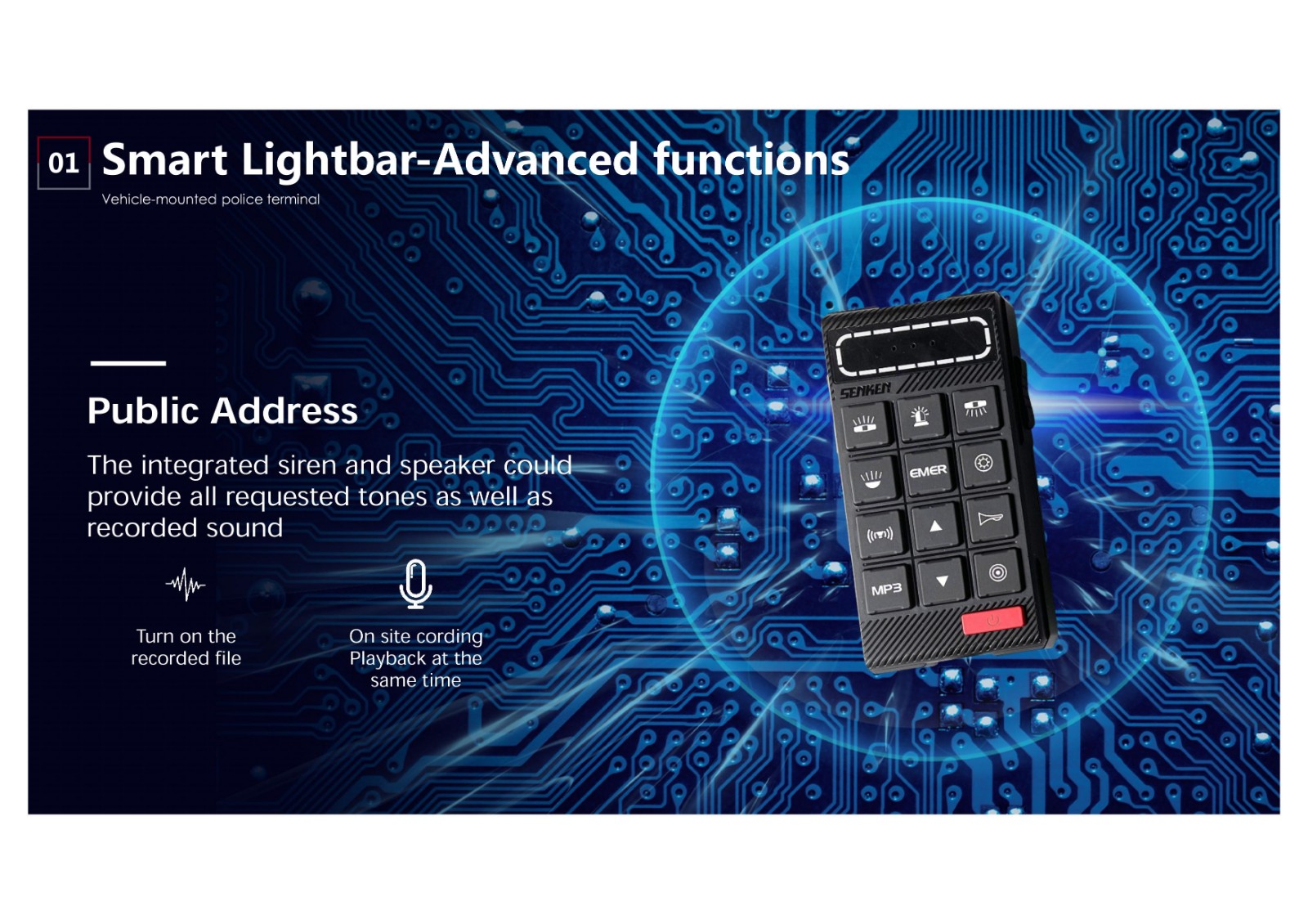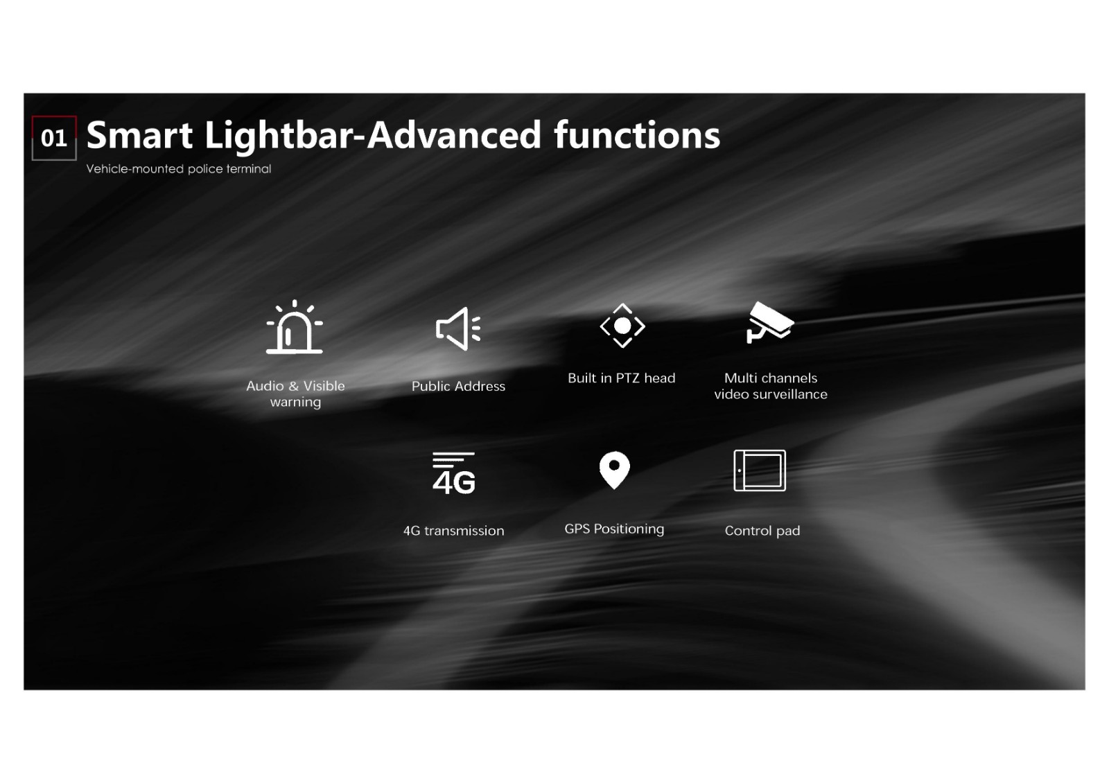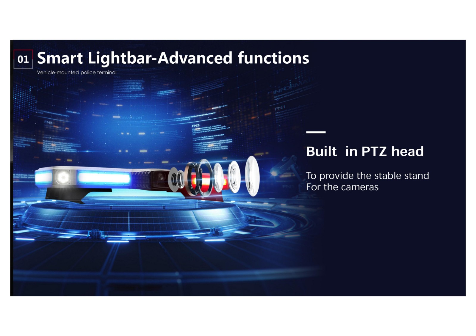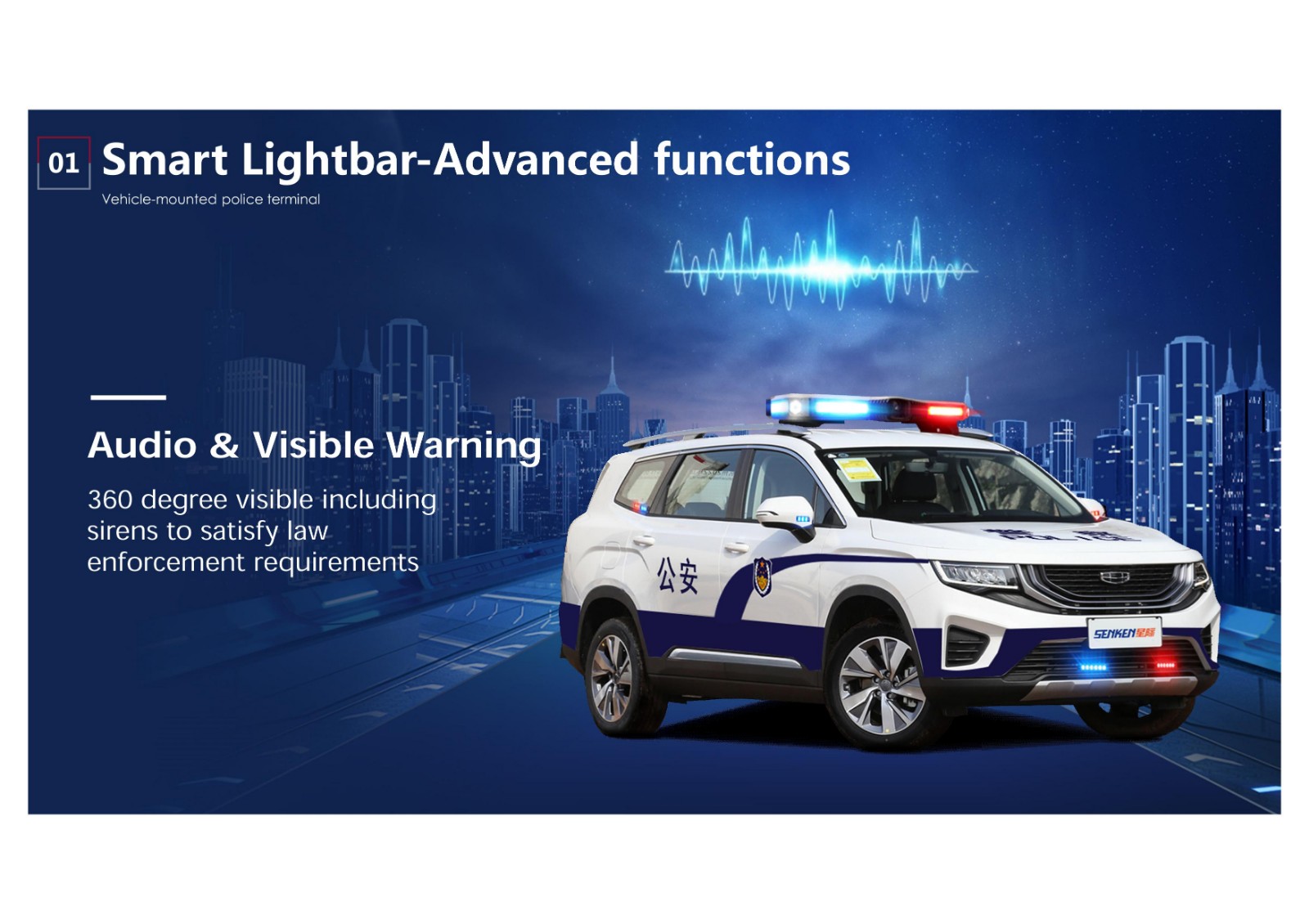 It is fully new compact design of smart lightbar integrated with lights, sirens, cameras and control pad, with functions of image or video wireless transmission, ideally for the application of traffic police force to achieve the efficient patrol duty, to enable the command center to quickly grasp on site police force situation and reliable data proof. ANPR and speed enforcement could be realized based on SDK developed tools according to different countries policies.