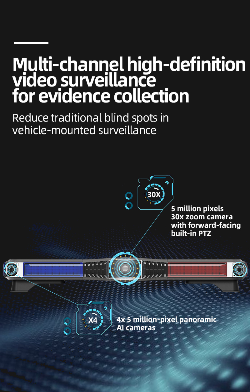 Es handelt sich um eine voll neue kompakte Gestaltung von intelligenten Lichtstäben, die mit Lichtern, Sirenen, Kameras und Kontrollpolster integriert sind, mit Funktionen des Bild-/Video -drahtlosen Getriebes, idealerweise für die Anwendung der Verkehrspolizei, um den effizienten Patrouillendienst zu erreichen, damit das Kommandozentrum schnell vor Ort der Polizei und zuverlässigen Datennachweisen erfasst. ANPR- und Speed -Durchsetzung konnten aufgrund von SDK -entwickelten Instrumenten gemäß verschiedenen Richtlinien der Länder realisiert werden.