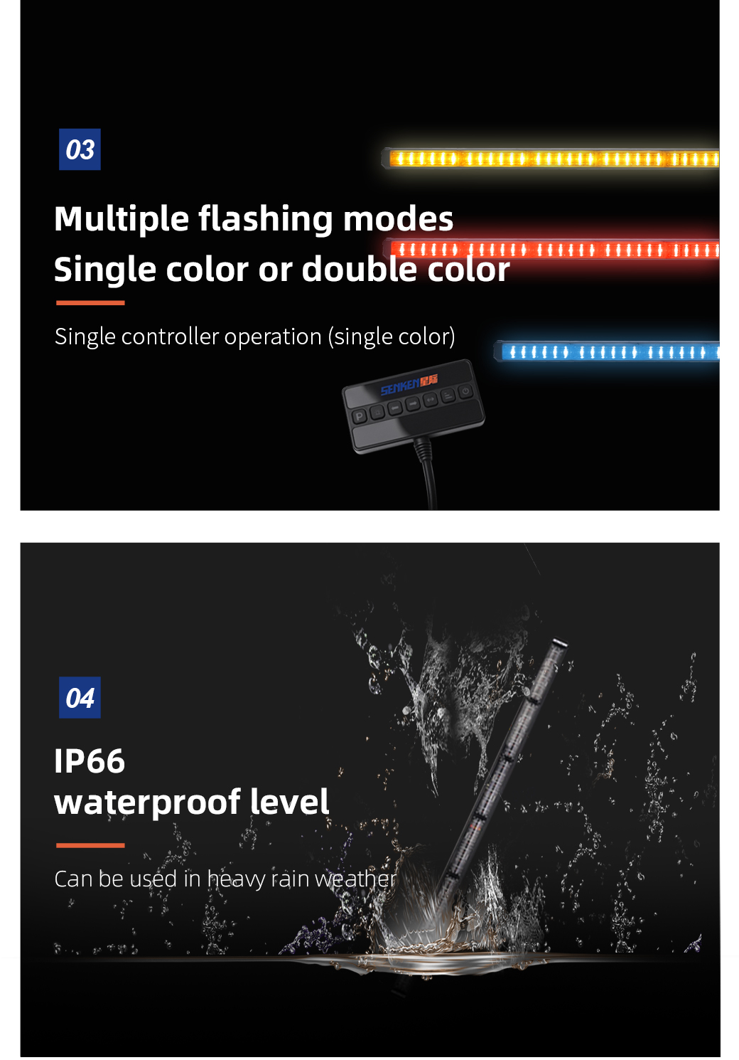 FeaturesAdopts 60 pcs High intensity LEDAvailable in solid and split colors – red, blue, amber, white Built-in 12 Selectable flash patterns and directional patternCan be used as a dash light or Grille lightVibration, moisture and corrosion resistanceRated IP67 for dust and water resistance