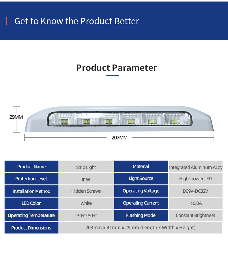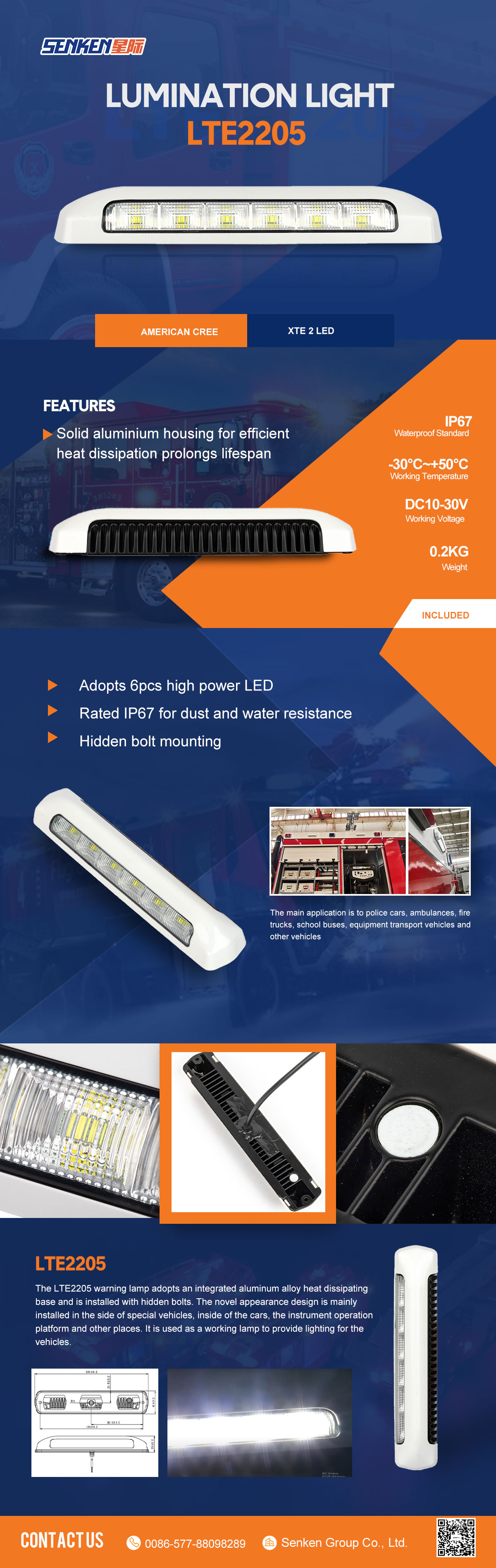 The LTE2205 warning lamp adopts an integrated aluminum alloy heat dissipating base and is installed with hidden bolts. The novel appearance design is mainly installed in the side of special vehicles, inside of the cars, the instrument operation platform and other places. It is used as a working lamp to provide lighting for the vehicles.The main application is to police cars, ambulances, fire trucks, school buses, equipment transport vehicles and other vehicles