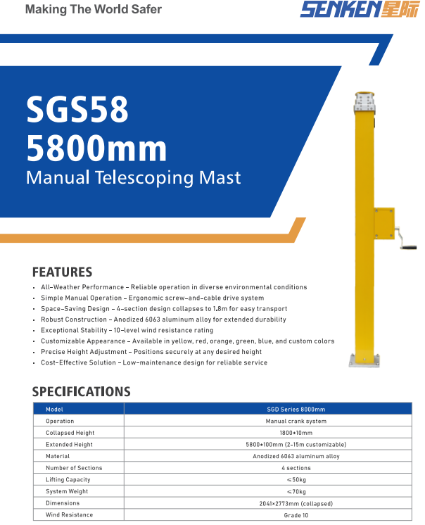 Senken Launches SGS58 5800mm Manual Telescoping Mast: All Weather Stability & Cost Effective Height Solutions
