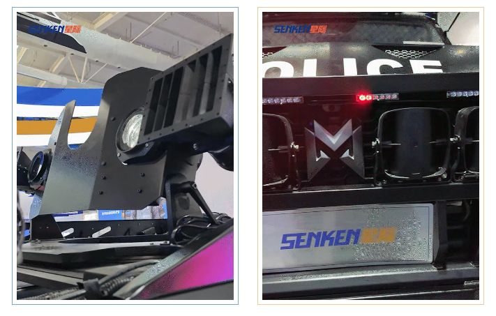 The rotating platform on the roof is equipped with a high-power acoustic wave disperser and a laser dazzler, which can rotate 360° horizontally and move vertically over a large range. Combined with multiple high-frequency sirens at the front of the vehicle, it achieves a combination of strong light flashing and directional sound waves to instantly control the scene and deter crime!