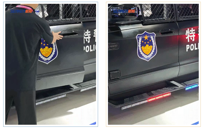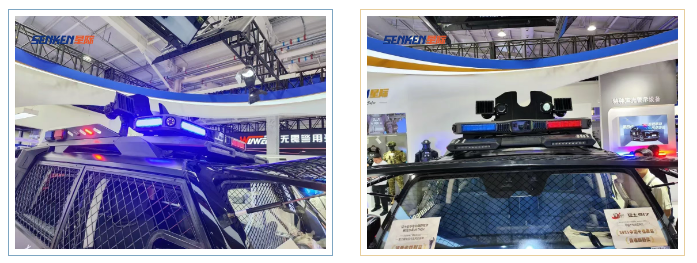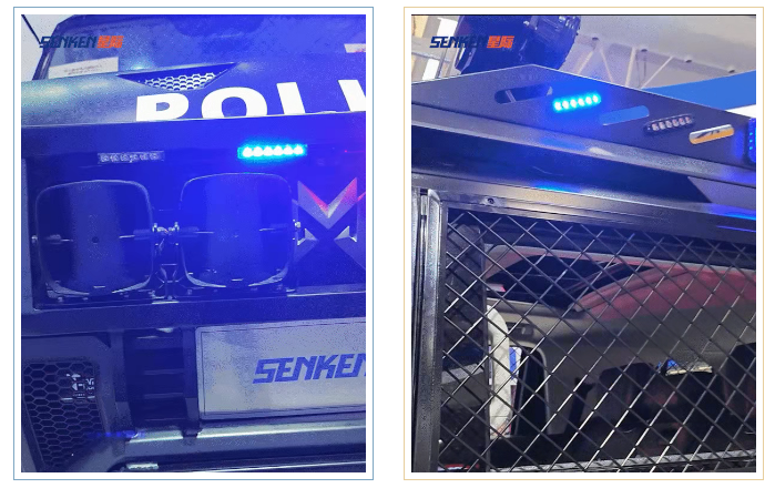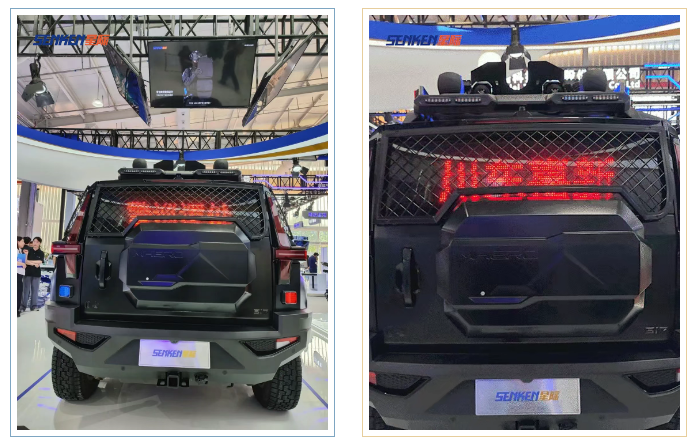Based on the overall vehicle model and practical combat needs, and using the star warning light product system as the foundation, a matching design is carried out. Intelligent warning lights, small warning lights, and transparent displays are installed on the roof, around the vehicle, and at the rear. This achieves an overall high-brightness warning while maintaining the coordination and unity of the entire vehicle, realizing a warning effect of “N+”.