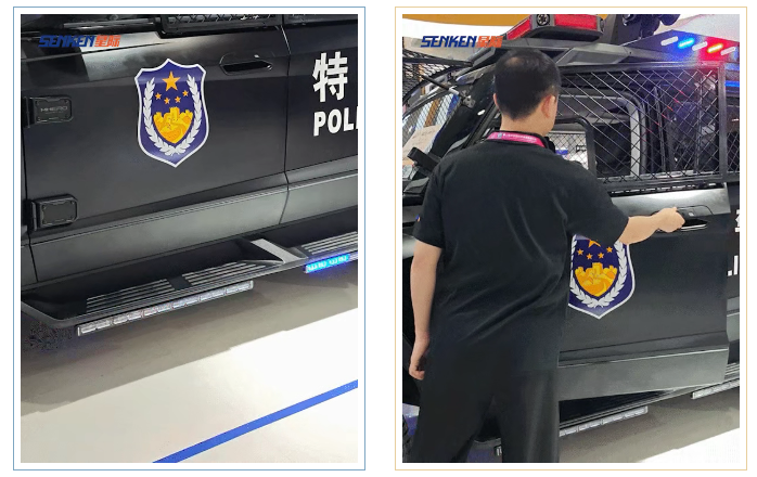 The vehicle body and police equipment are interconnected. Once the vehicle door is closed/opened, the police equipment is automatically activated/deactivated, eliminating the need for constant manual adjustment and maximizing efficiency!