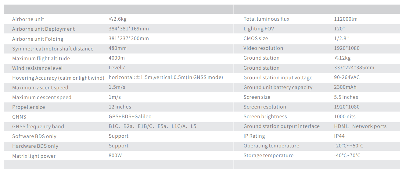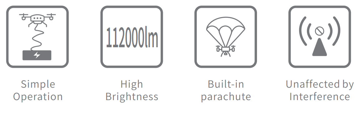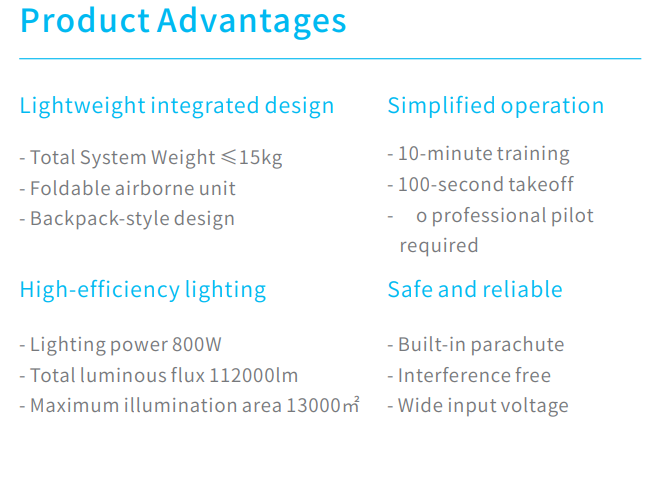 This is a lightweight lighting tool suitable for multiple scenarios with high efficiency. It can achieve long-duration lighting when paired with an outdoor power supply or acar’s external discharge function. Compact in size, the combined weight of the aerial unit and ground unit is only 3.5kg, allowing single-person portability, making it suitable for various scenarios. Moreover, it is easy to operate, taking only three minutes from being in the backpack to being deployed. Truly living up to being usable by everyone, operable by everyone, and affordable for everyone, it is an extremely simplified lighting tool. Unlike other lighting drones, it requires no training— one can learn to use it just by reading the user manual, with no need for professional pilots to operate it. Additionally, it supports dual mode operation, ensuring worry-free use and rapid deployment. Compared to other aerial lighting equipment, its price is more budget-friendly.