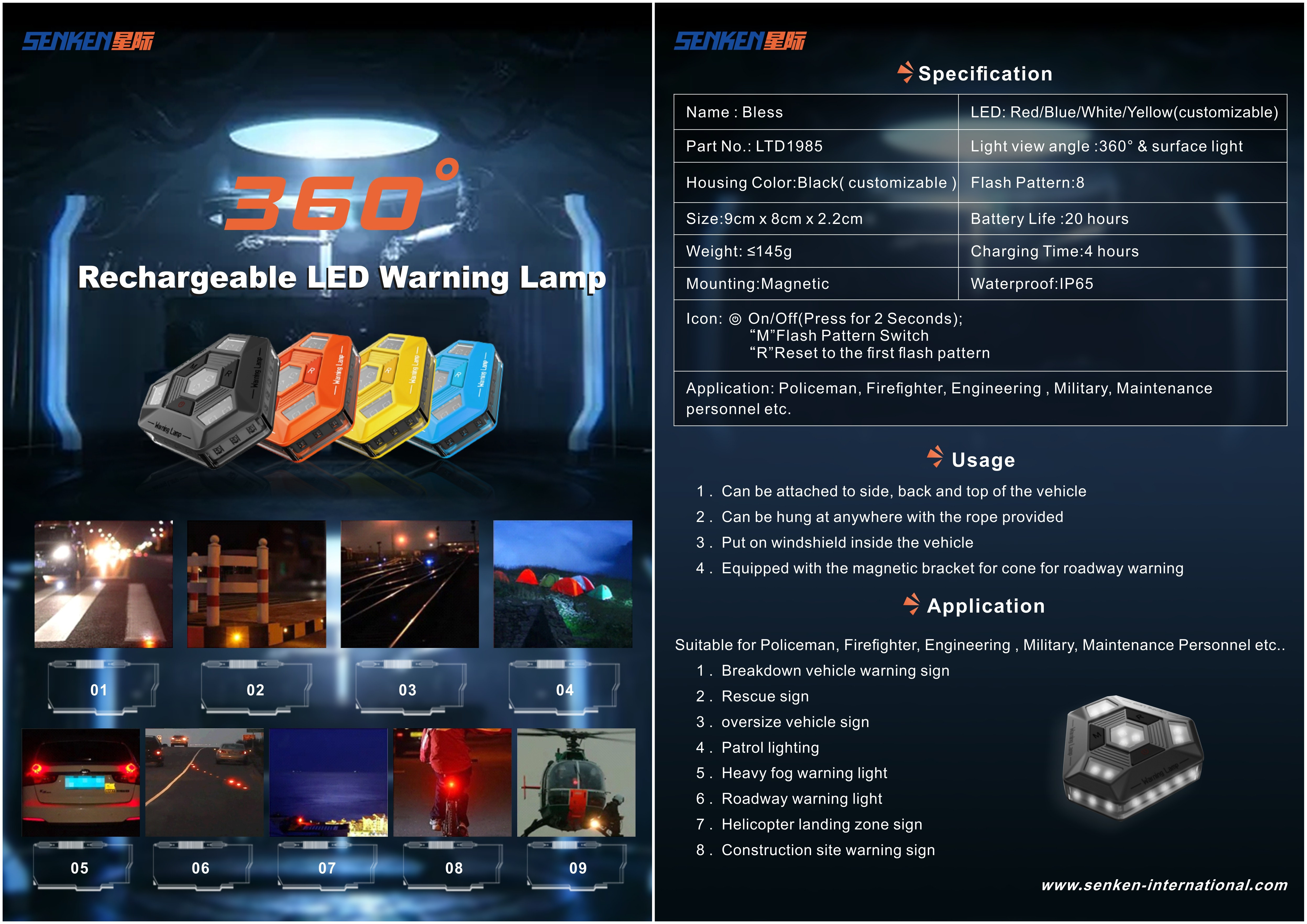 Luz de advertência magnética LTD1985, 360°, Luz de advertência recarregável