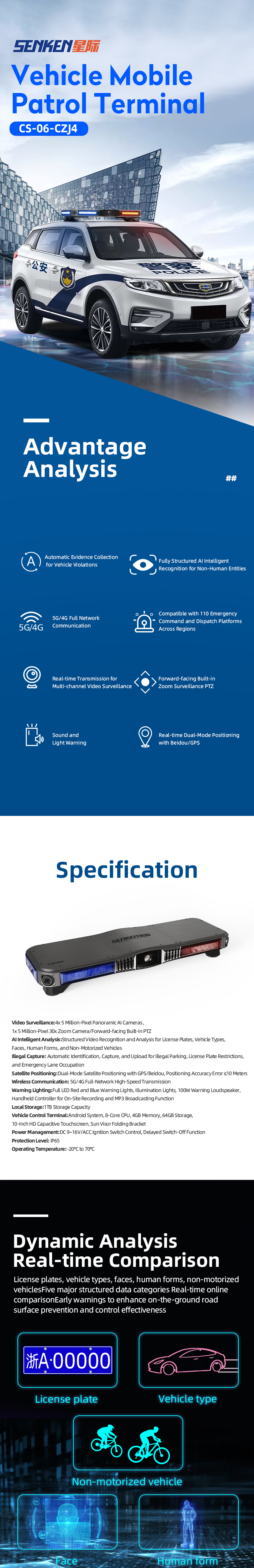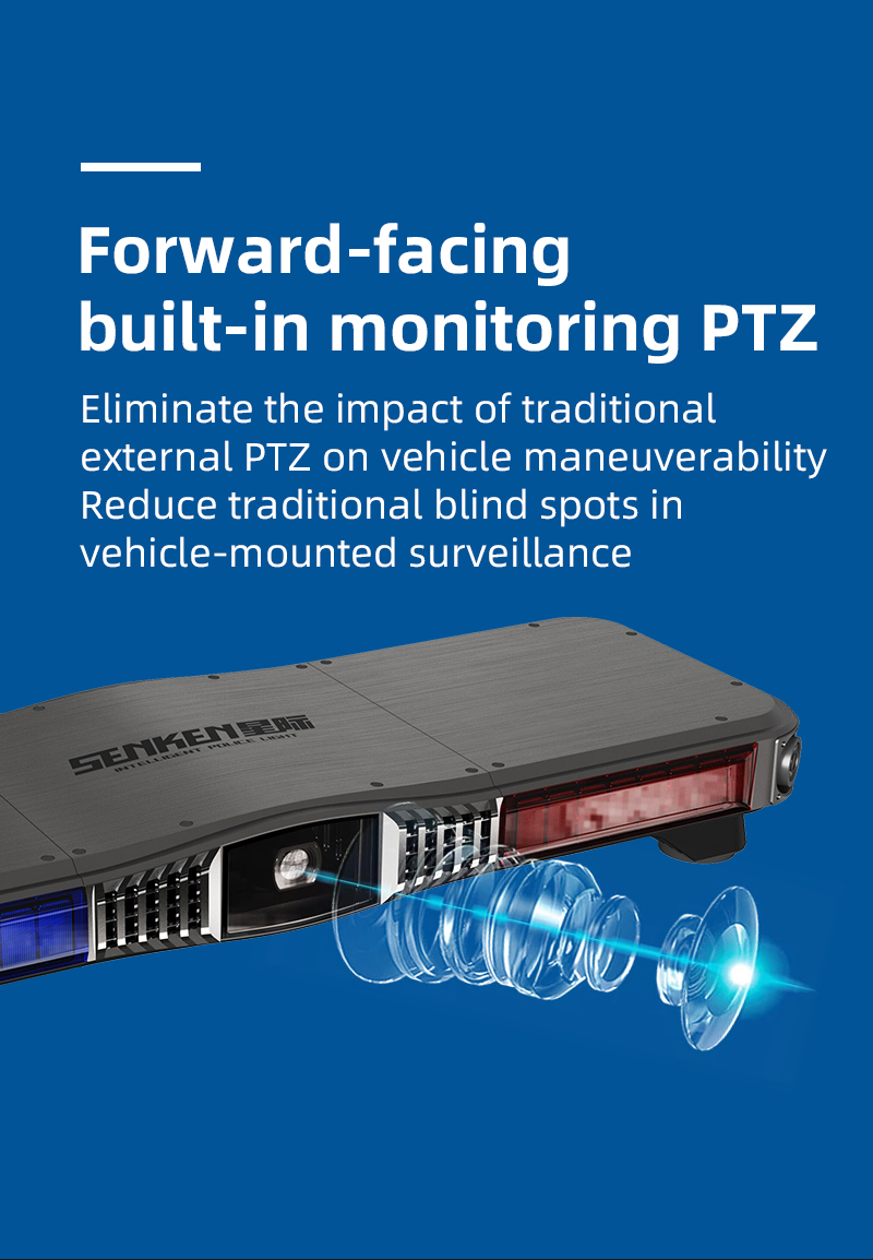 Это совершенно новая компактная конструкция интеллектуальной световой панели, интегрированной с фарами, сиренами, камерами и панелью управления, с функциями беспроводной передачи изображений/видео. Она идеально подходит для применения дорожной полицией для эффективного патрулирования, позволяя командному центру быстро отслеживать ситуацию на месте и получать надежные данные. Распознавание номерных знаков (ANPR) и контроль скорости могут быть реализованы на основе инструментов, разработанных в SDK, в соответствии с политикой разных стран.
