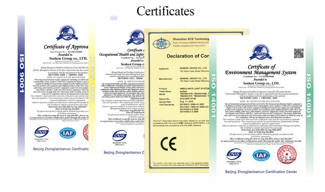 A3: We are supplying E-MARK, SAE, ROHS and NIJ certificate for different products based on different countries. For enterprise ceritificates, we have ISO9001, IS140000, ISO180000.