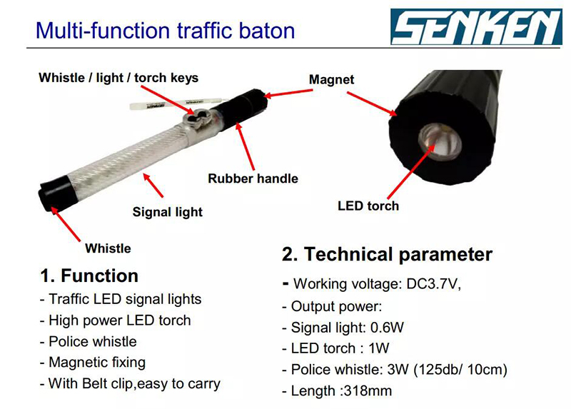 Senken Multifunctional Police Lighting Baton With Whistle ZHB-JS01 Features: High light intensity flashlight, using 1-3 W high power high intensity LED Magnetic function: Fix easily Traffic direct LED light 1W, and color options (Red and blue)can be chose. (R&B warning light mode: Red, flashing Red) Rubber hand lever: comfortable touch, non-slip and durable.