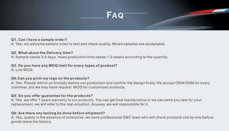 A7: It will take us about 2 to 3 weeks for normal orders, for customized products, will consider the development process, normally 8 weeks most.